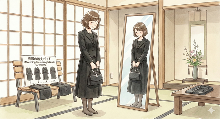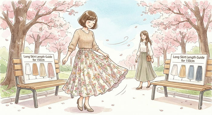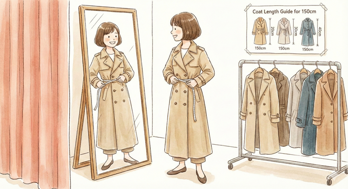 身長150cm前後の女性がバランスよく着られる着丈の目安をまとめました。