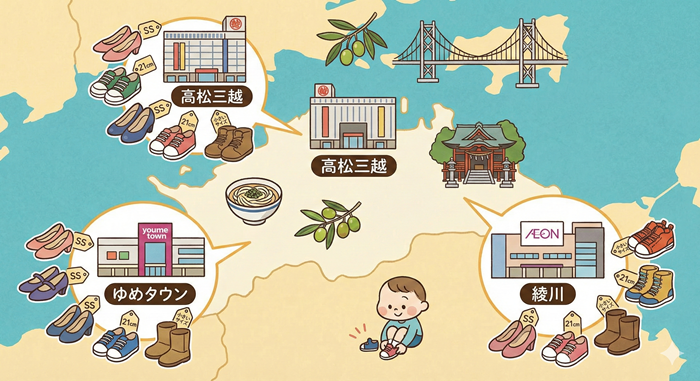 しかし、県内の一般的な靴屋さんでは「Sサイズ(23.0cm〜)」が多く、小柄な足には大きすぎるのが悩みどころ。 「三越には小さいサイズコーナーはあるの?」 「ゆめタウンと綾川イオン、どっちに行けばいい靴がある?」